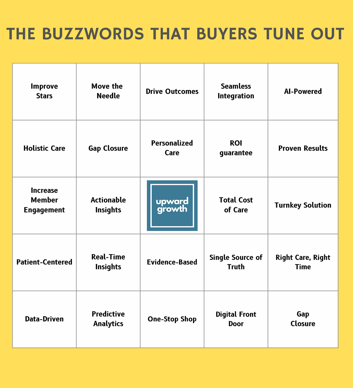 Each square on that card above reflects a claim that health plan executives can now recite from memory. The problem isn’t that these phrases are irrelevant; in fact, each phrase is something that health plans genuinely care about. Unfortunately, repetition has dulled much of the meaning of each. To see how, let’s take the most common examples and break down why they’re tuned out: