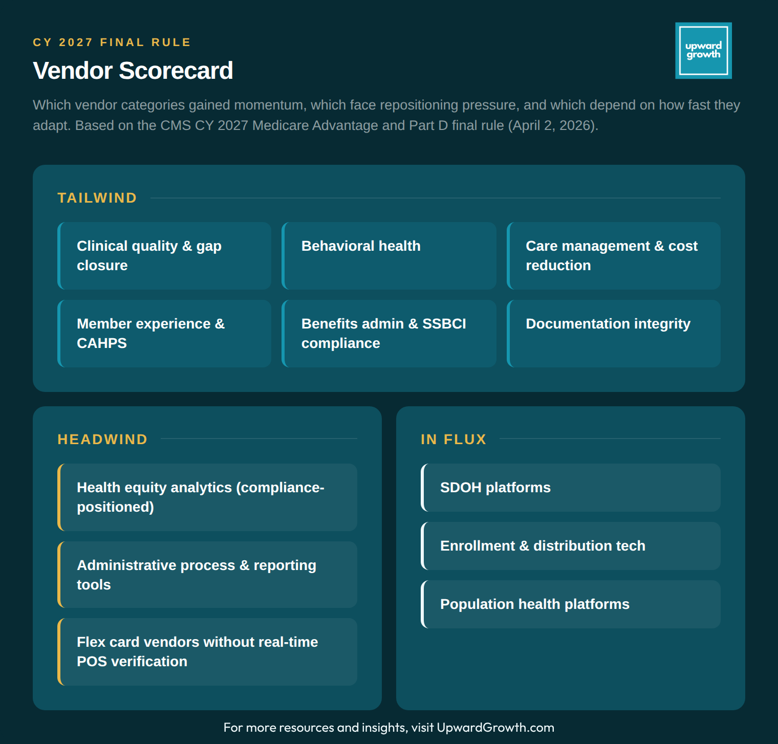 If you sell benefits administration platforms, card technology, or supplemental benefit solutions, the real-time POS verification requirement is a technology mandate, and plans will surface whether your platform supports it during CY 2027 bid preparation. If you're a plan evaluating your current card vendor, this is the question that tells you whether your partner saw this coming or got caught flat-footed.