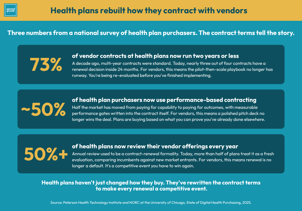 The contracting layer underneath the buying motion has been rebuilt around similar logic. Health plans are increasingly selecting vendors based on track record. In fact, performance-based contracting is in use by nearly half of purchasers and is growing. Seventy-three percent of vendor contracts run two years or less, and more than half of plans review their vendor solutions annually. The through-line is unmistakable: short contract terms with measurable performance gates are how plans run vendors when finance is in the room from the start.