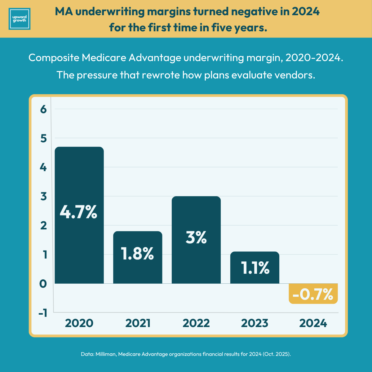 Margin compression at historic levels. Milliman’s analysis of 2024 statutory financial statements showed the composite Medicare Advantage underwriting margin at -0.7 percent for 2024, the lowest in five years. National carrier margins compressed about 20 percent year over year. The share of MA plans reporting positive underwriting margins fell from approximately 60 percent before 2020 to around 40 percent in 2023 and 2024. Every major MA carrier announced market exits, benefit cuts, or “margin over membership” pivots through 2025 and into 2026. At that level of pressure, every operating decision becomes a margin decision, which means the operating outcome and the financial defense have to be the same conversation.